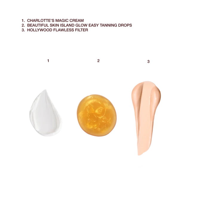 - Mix a couple of drops of Beautiful Skin Island Glow Easy Tanning Drops with a pea-sized amount of Charlotte’s Magic Cream, then massage into your face, ears and neck.